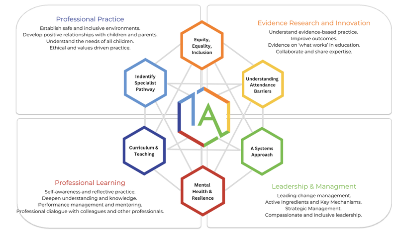 Our attendance approach is fundamentally guided by the Inclusive Attendance professional development model. Comprising six tailored Learning Modules, this model empowers us to deepen our understanding by facilitating continuous professional learning for all staff. Within this model, the four domains of practice ensure the provision of professional learning, professional development, evidence-based practices, and exemplary leadership and management to seamlessly integrate theory into practice.